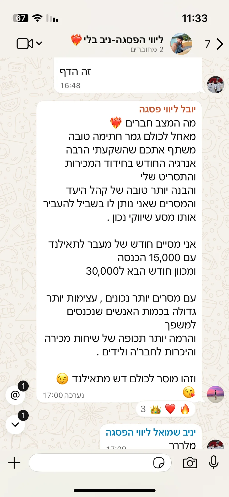 שזה פחות ממה שהכנסתי אז, אבל במקום לעבוד 12 שעות עבודה ביום אני עובד 4 שעות עבודה, אני לוקח חופש מתי שאני רוצה, אני משקיע בזוגיות שלי ומטייל בעולם עם 2 האחים שלי ואוטוטו גם אבא שלי מצטרף אלי.